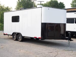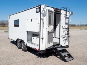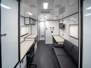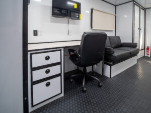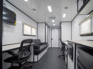 Our uniquely designed 20 foot trailer with a rear desk and dual axle is made for your mobile command needs. We’ll transform your imagination into reality.
