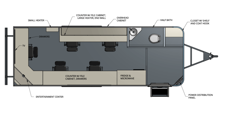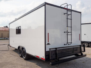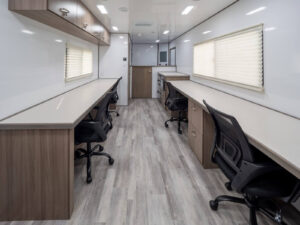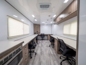 Our uniquely designed 20 foot trailer with a rear desk and dual axle is made for your mobile command needs. We’ll transform your imagination into reality.