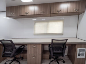 Rubber coin flooring in mud areas and linoleum floors along with solid drawer fronts and contemporary designed cabinets provide a professional look that cleans easily allowing you to maintain a professional looking office space. We also provide Hi-def televisions and wi-fi and sofas that provide the comforts of home while maintaining your high standards of office productivity.