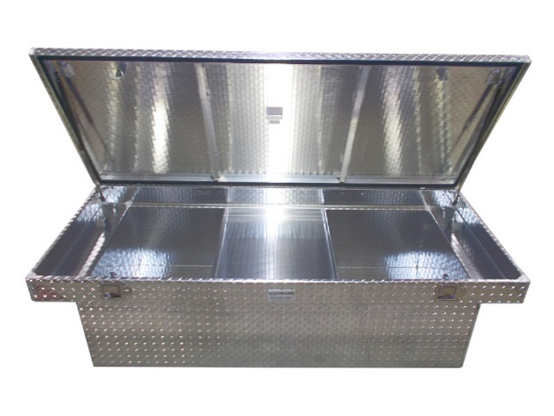 The Alum-Line Cross Over Aluminum Boxes are built with the same quality materials and workmanship as all of our other aluminum products. Built for a lifetime of use is what Alum-Line Cross Over Aluminum Boxes are all about. You can't go wrong with Alum-Line cross over tool boxes. Our cross over tool boxes are built with commercial use in mind, with heavy gauge aluminum and continuous welded seams where you need it most. Durable hardware includes stainless steel double connecting paddle latched and smooth operating gas prop lids. The lids on Alum-Line Cross Over Aluminum Boxes are reinforced with tubing on the inside. This provides a reassured stability and strength allowing any weight to able to be stacked on top of Alum-Line's cross over tool boxes.