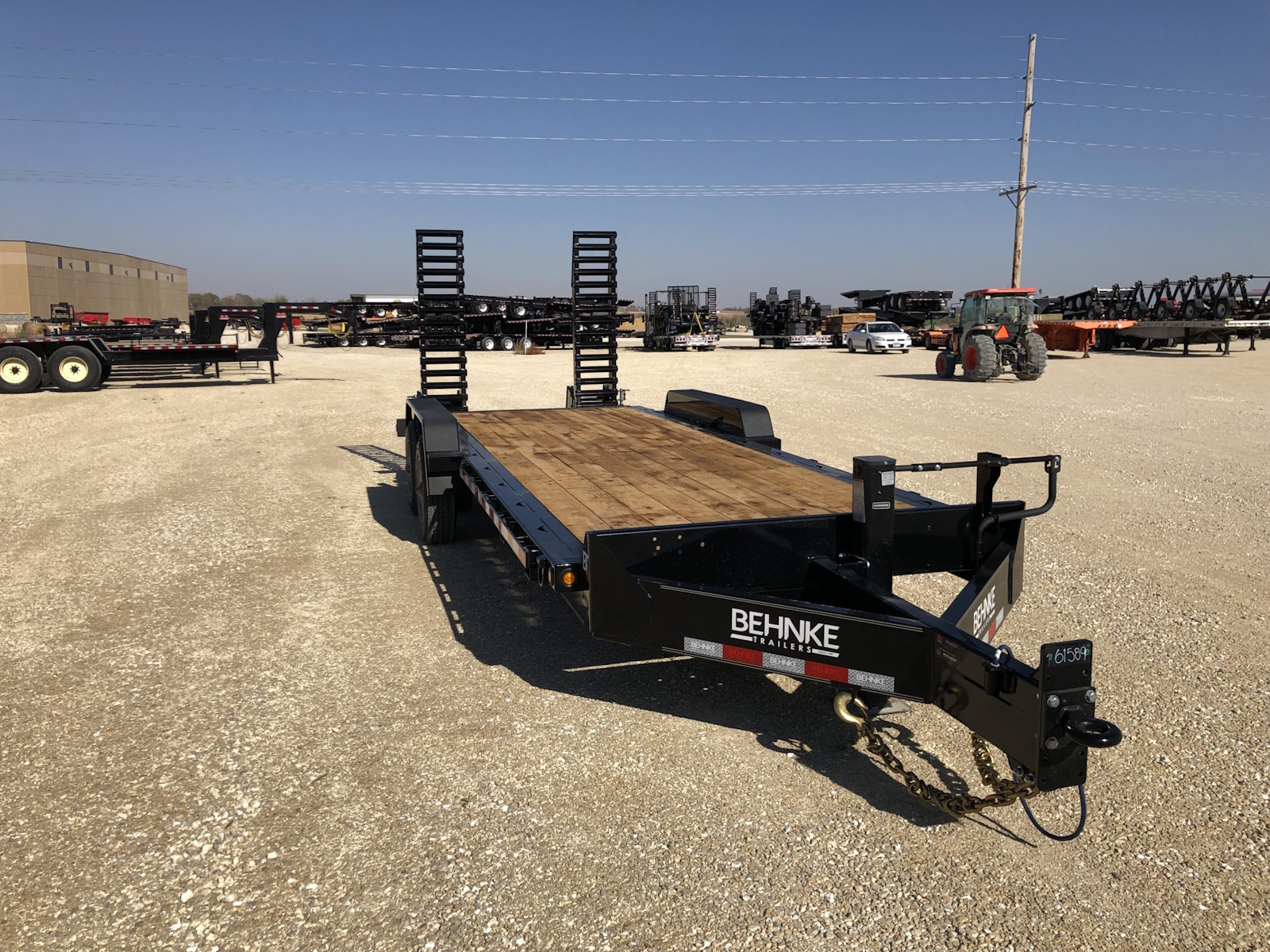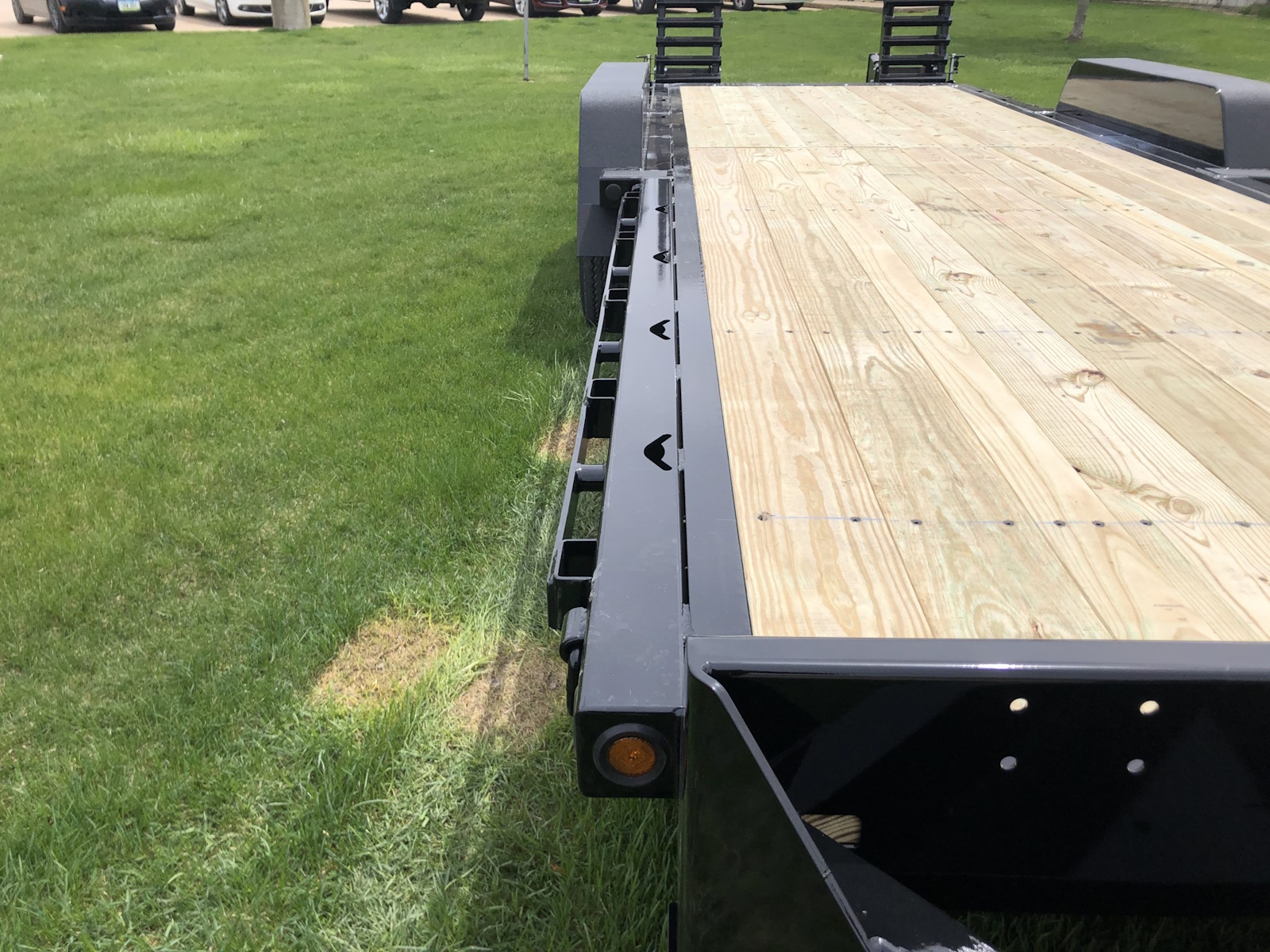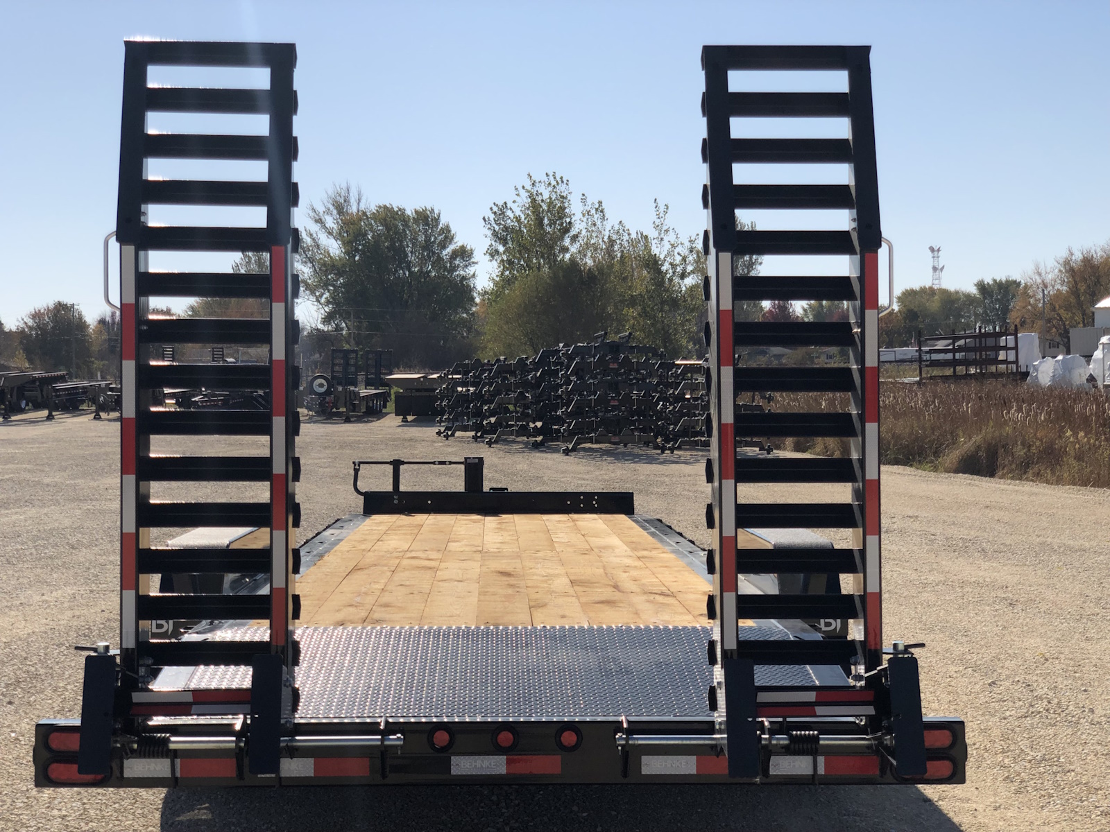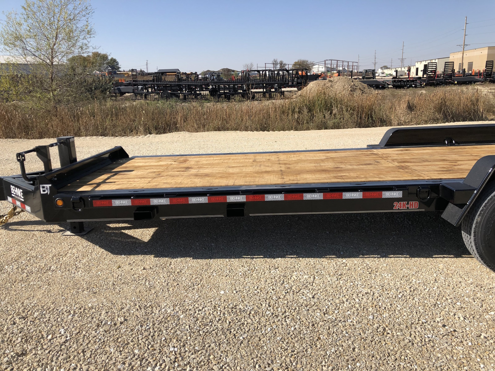 The 24,000 lb. GVW HD channel equipment trailer is a monster, it comes standard w/ (2) 12,000 lb. electric brake axles and is built out of a heavy 10" x 20 lb. continuous channel frame. This trailer is also equipped with 17.5 super single tires to handle the heavy loads it can haul. There is a full 83" between fenders and fender guards also come standard on the 24K HD model to help guide skidloader buckets in between the fenders. Standard tie downs include D-rings and chain slots to tie-down heavy equipment. Pull-type and gooseneck configurations are available.