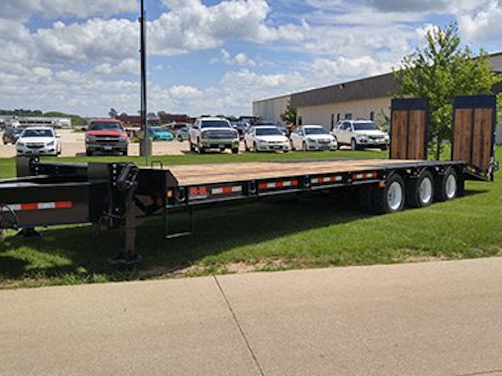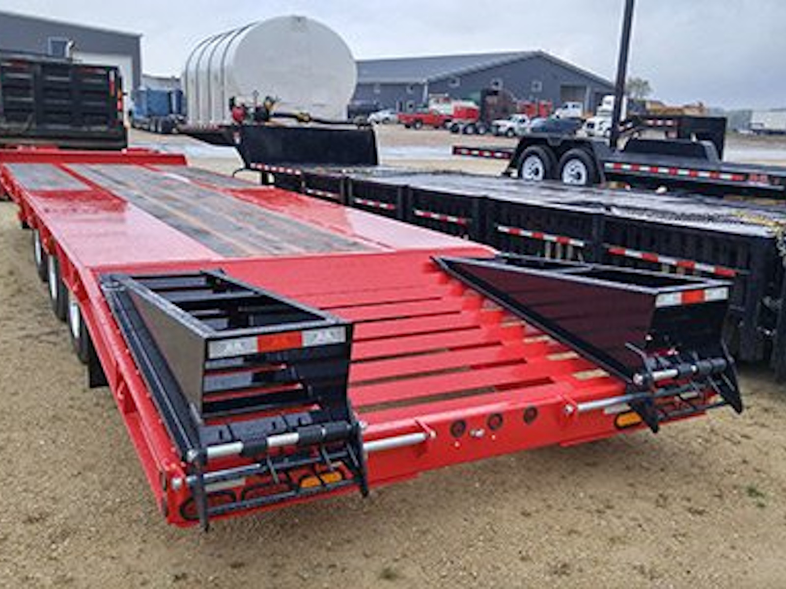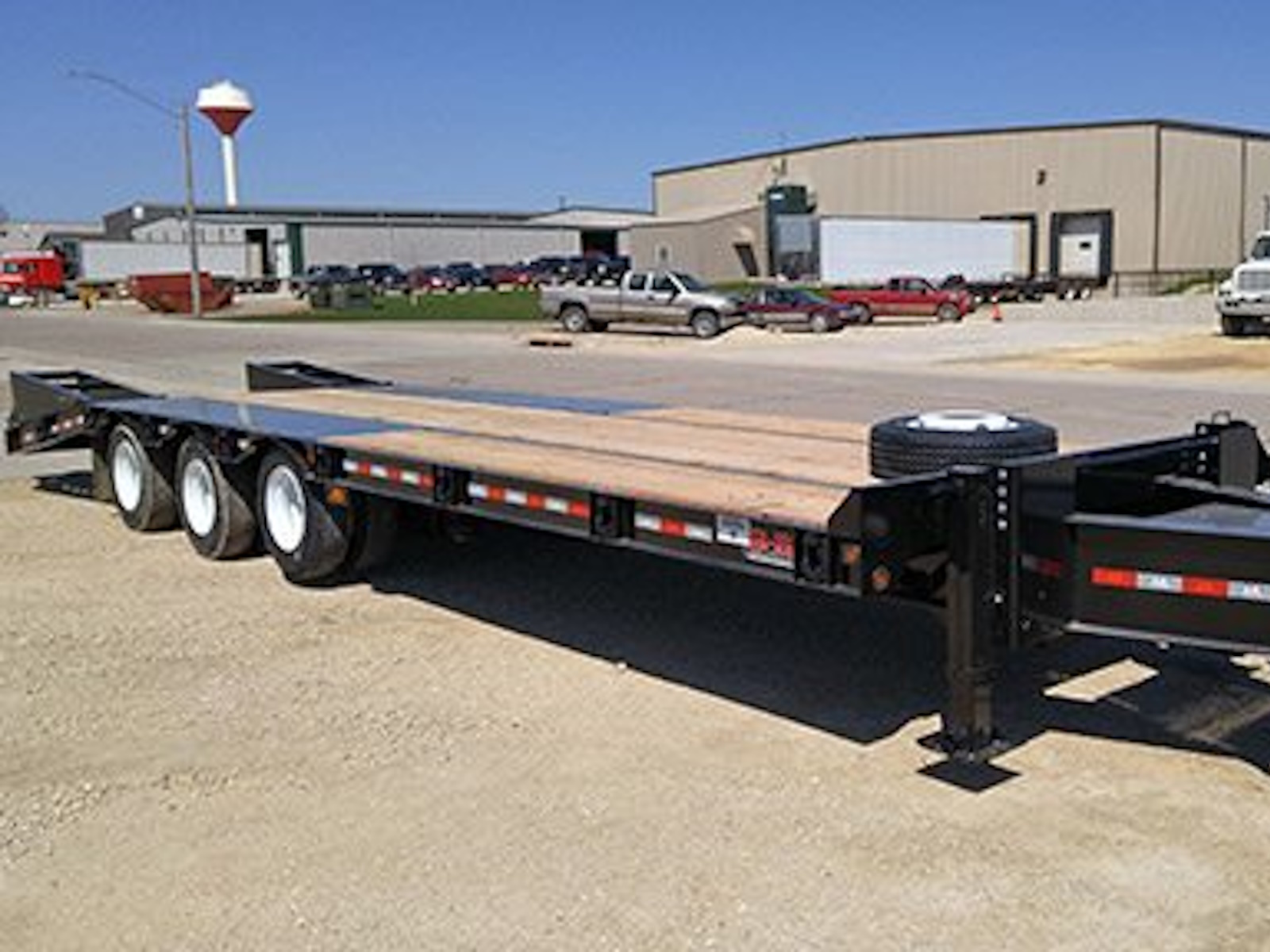 Our 50K tag trailers are pull-type trailers with (3) 22,500 lb. air brake axles and dual 235/75R 17.5 tires, which provide an ultra-low 34" unloaded deck height. These trailers utilize a one piece fabricated I-beam constuction (80 ksi) with 4" jr. I-beam x-members (80 ksi) and oak decking. Bed lengths are available in 20-32' lengths and a 6' self cleaning angle iron beavertail is standard, but many other beavertail and ramp combos are available