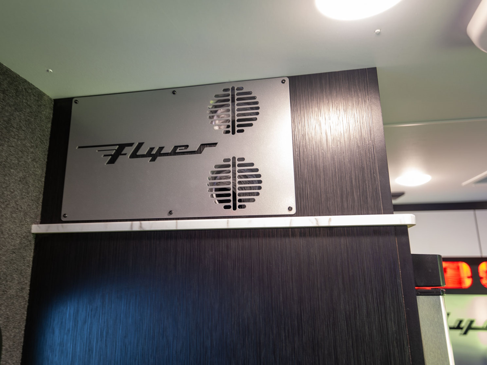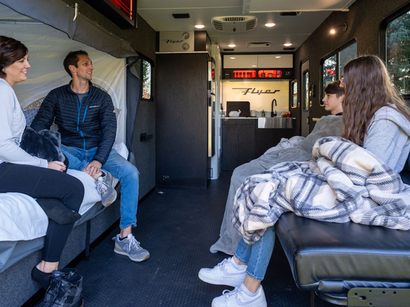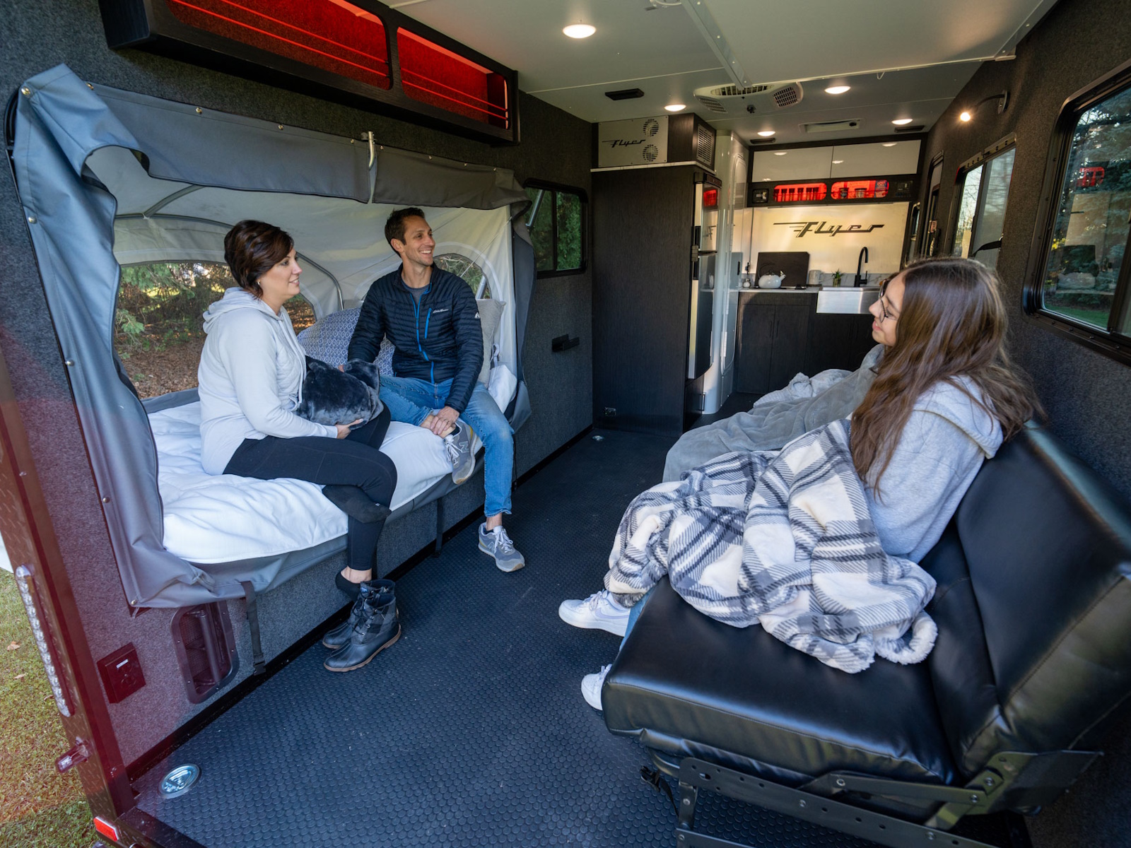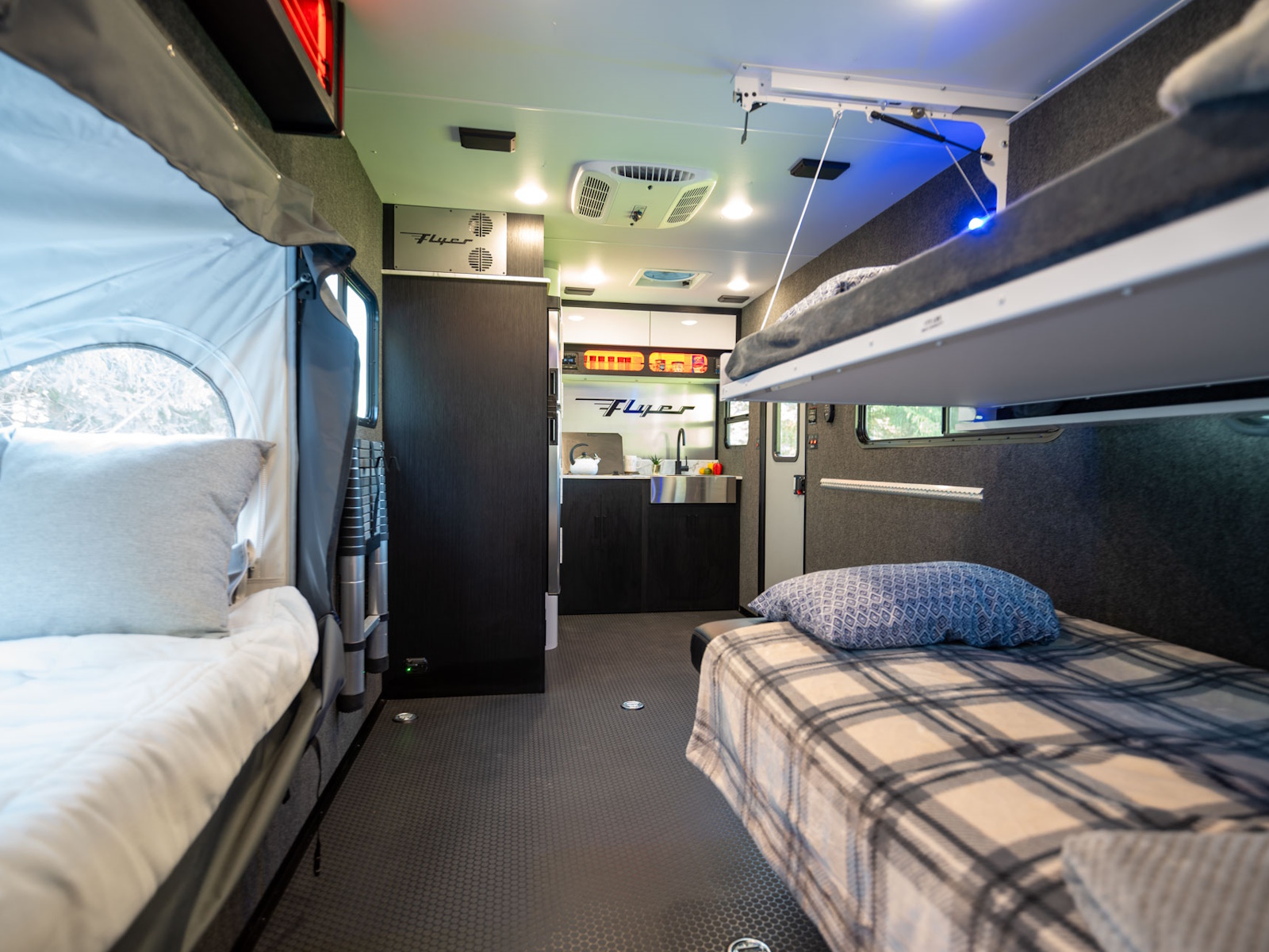Discover the exceptional use of space in the Flyer Forge. The spacious garage area serves a dual purpose as a sleep space, featuring a standard roadside tip-out and a sleeper sofa. For additional sleeping, consider the optional drop-down bunk or curbside tip-out to maximize sleeping capacity. For added flexibility, some campers may choose to incorporate an inflatable mattress on the floor, significantly expanding your available sleeping area.